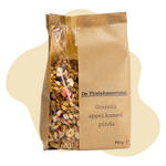 3-korenvlok* (TARWEvlokken*, GERSTvlokken*, ROGGEvlokken*), HAVERvlokken*, 9.5% rozijnen* (9.4% rozijnen*, 0.1% zonnebloemolie*), rijst crisps* (rijstmeel*, TARWEmeel*, suiker*, GERSTemout*), 8.1% appelconcentraat*, zonnebloemolie*, 6.7% PINDA* (6.6% PINDA*, 0.1% zonnebloemolie*), TARWEstroop* , TARWEbloem*, 2.9% gedroogde appelstukjes*, TARWEzemelen*, 0.3% kaneel*