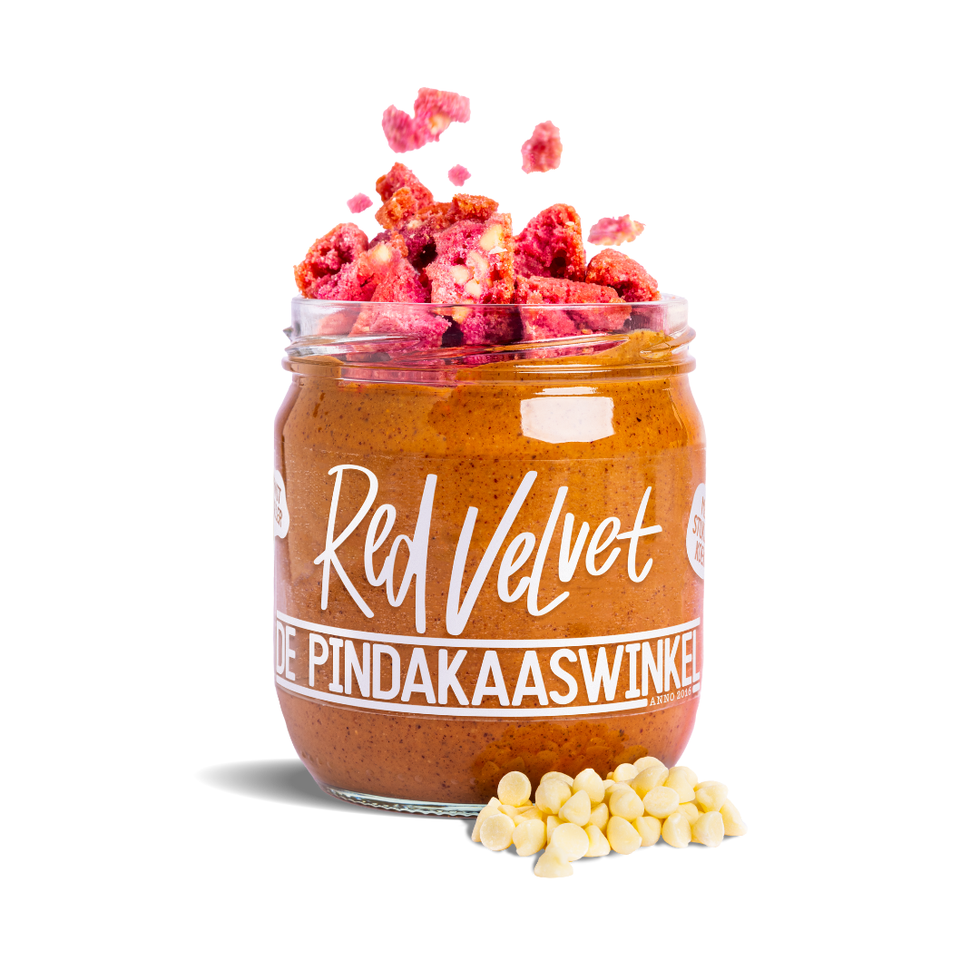 Ingrediënten: 88% PINDA, witte chocolade (LACTOSE, SOJA), red velvet koek (TARWEbloem), suiker, rode bieten concentraat, plantaardige olie, kokosolie, zeezout.